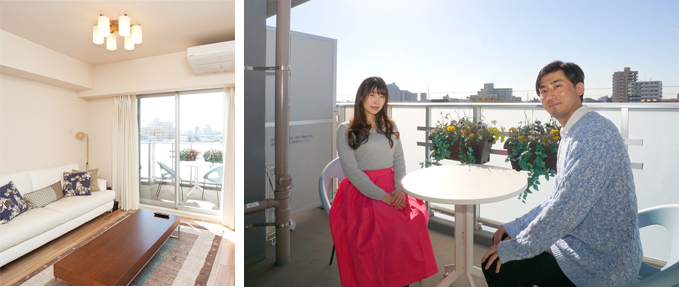 角住戸ならではの窓付の浴室、同じく戸建て感覚の専用ポーチ、そして奥行約2mある広々としたバルコニーも、お二人のお気に入りのポイントとのこと。バルコニーには最初からプランターが設けられていることなども、このお住まいならではのプラスアルファの魅力となっているようです。さらにバルコニーからは、「東京スカイツリーを眺めることができるのが嬉しい」と、お二人は声を揃えます。