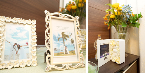お二人の新居に華やかさを添えているのが、ハネムーンを兼ねてハワイで挙式を挙げたときのお写真。特別なフォトフレームによってお部屋に飾られ、まさに幸せなお二人の暮らしを象徴しているようです。